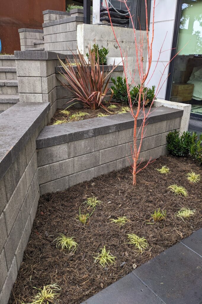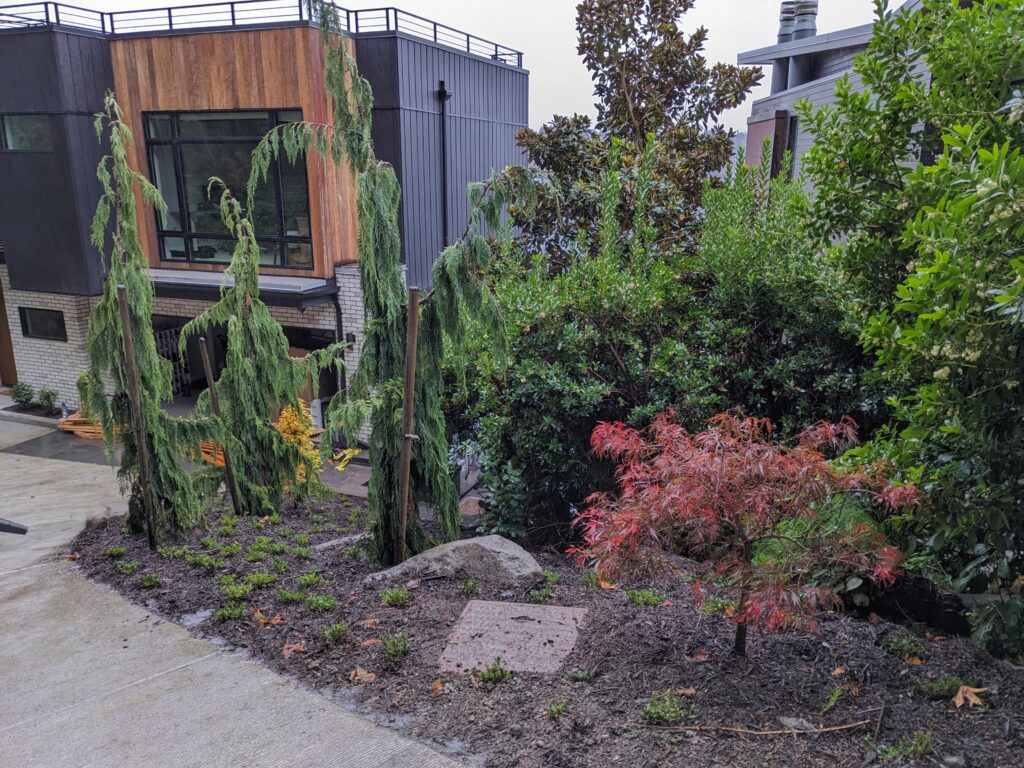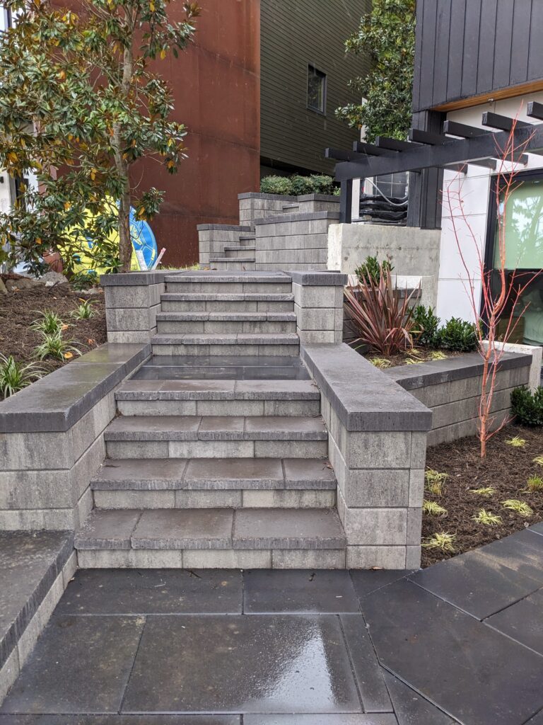 A steep Mercer Island waterfront property built around water management and long-term stability. Major hardscape work was paired with mitigation planting in both the shoreline buffer and a piped watercourse buffer, completed per approved plans and conditions using native plant stock in the regulated areas.